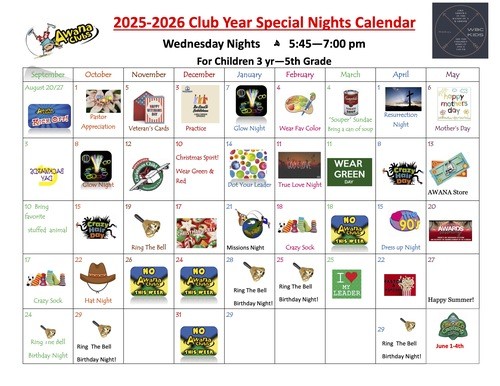 Join us for AWANA on Wednesdays from 5:45 - 7:00 for children aged 3 years to 5th grade to learn about Christ through scripture memorization, Bible study, and Game time.